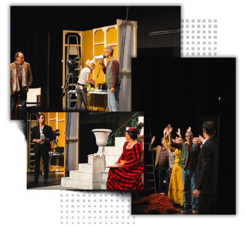 L’équipe du film « Une étoile est morte » s’est installée au Théâtre Beaulieu pour tourner une séquence dans laquelle un mari trompé interrompt la représentation pour tuer l’amant de sa femme. Nous allons voir qu’en coulisses, tout n’est pas rose et que les jalousies vont bien au-delà de la fiction. Le réalisateur, amoureux d’une jeune actrice, est rongé par la jalousie et veut démasquer son rival. L’assistant réalisateur, rêve de réaliser son premier film. La jeune actrice n’a aucune limite pour décrocher le premier rôle. Le producteur est bien sûr véreux, et on se demande bien si vous n’êtes pas un peu inconscients de vous rendre à ce tournage dans lequel le public fait partie de l’histoire car c’est le figurant de ce film.